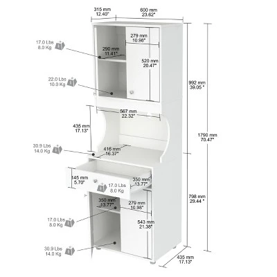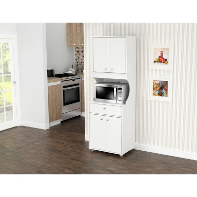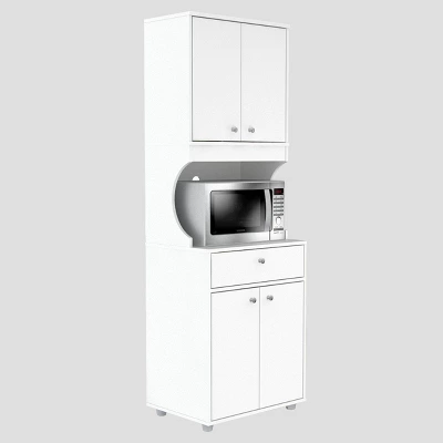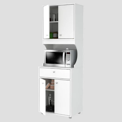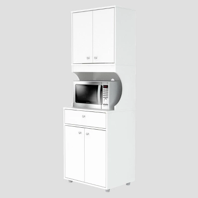 GALLEY Series Kitchen Storage Cabinet by Inval finished in a rich “White” laminate with durable melamine which is stain, heat and scratch resistant. It is constructed from manufactured wood and features a functional modern design that is an excellent choice for your home or office break room. It includes two (2) top doors and two (2) bottom doors featuring concealed European style hinges and embellished with brushed metal knobs. Each set of doors conceals one (1) adjustable shelf. Also included is one (1) large drawer with metal drawer glides for storing accessory items such as utensils. This unit has a convenient cable pass-through which is ideal for your appliances. Anti-tip hardware is included.