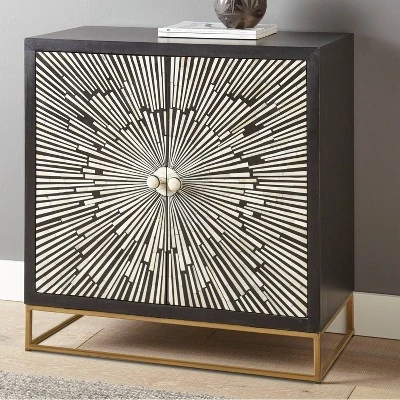 Modern elegance with an Art Deco design, Amika offers timeless style in a functional Accent Cabinet. The front doors feature a sunburst design of black and white bone and resin making it the focal point of your room. A contemporary brass base and neutral hardware give the piece the feel of old Hollywood glamour. Two adjustable shelves provide storage for sweaters, clothing or even electronics to provide the ultimate in functionality and style. Your purchase includes one accent cabinet.