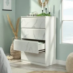 - Open storage shelf above top drawer holds folders, binders or reams of paper.