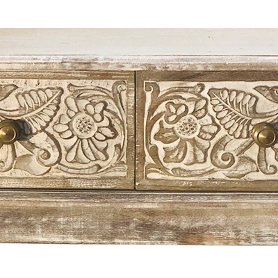 Flaunt your exotic decor items and at the same time revive your living space or entrway with this traditional style Console Table. Features 2 smooth gliding drawers with intricate floral motif drawer front that adds striking appeal to its overall design while the antique knob pulls offer easy accessibility. Handcrafted from mango wood in the hues of brown and white finish, it is supported on cabriole legs and showcases rough hewn saw texture details.