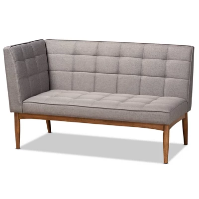 Maximize your dining room space with the superb comfort and casual style of the Sanford banquette set. Made in Malaysia, this set includes one armless bench and one corner bench, each comprised of walnut brown finished wood. Each piece is padded with soft foam and upholstered in gray fabric for smooth comfort with every meal. Requiring assembly, the Sanford utilizes a biscuit tufted design for texture and depth with a modern touch. Angled, tapered legs complete the look. Ideal for smaller dining rooms and nooks, the Sanford banquette set rejuvenates any space. Dimensions: 31.5″ High x 74.4″ Wide x 53.5″ Deep; Seat Dimensions: 17.3″ High(From Floor) x 67.5″ Wide x 47.2″ Deep; Back: 14.2″ High; Legs: 11.4″ High;