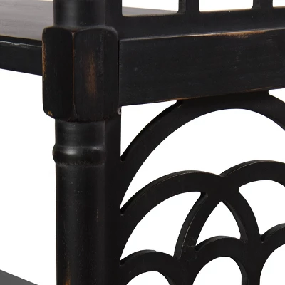 This three tier console table from the Signature Collection by StyleCraft Home Collection serves as the ideal centerpiece in your living room, foyer, or bedroom. Crafted from a combination of woods, this table is the perfect choice to showcase your pictures and home decor trinkets. The all-black finish with distressing, will complement any existing decor. Due to lighting and monitor differences, actual colors and finishes may vary slightly from what appears online.
