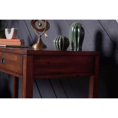 Create a studious transitional office with the Leanna Writing Desk. A rich brown finish coats the solid wood frame and slender legs, creating a warm and regal aesthetic and timeless look. Two narrow drawers organize office supplies and keep a tidy desk space for working. Two metal hardware pieces offer a classical element and metallic accent. Place this transitional writing desk in a library or living room to create a remote home office space.