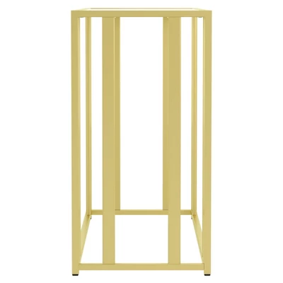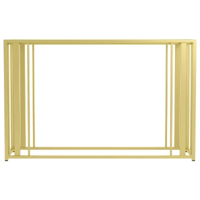 Sleek, straight lines and crisp, clean angles add stylish allure to this modern sofa table. Uniquely designed, this exquisite piece exudes intriguing, artistic appeal. The metal base is beautifully crafted with an elegant, matte brass finish. The smooth, rectangular tabletop is made with clear tempered glass for added dimension and style. Place it with a matching end table and coffee table, sold separately, to create a living room that radiates modern glamour.