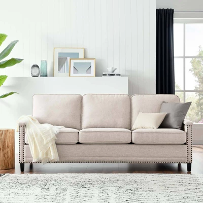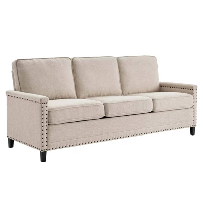 Sit back and relax amidst streamlined style and supportive comfort with the Ashton Upholstered Fabric Sofa. Perfect for the living room, bedroom, office, or lounge area, this sofa is enriched with a tailored profile, separate seat cushions, and a classic nailhead trim. Upholstered in polyester fabric, this living room sofa is padded with dense foam and complete with a spring pocket support system to offer a premium seating experience. Durably crafted, this sofa rests on solid wood legs with non-marking foot pins to protect flooring. Say goodbye to the days of hauling heavy furniture because Ashton ships in a conveniently portable box that’s easily maneuverable up staircases and narrow hallways. Assembly required. Sofa Weight Capacity: 1103 lbs.
