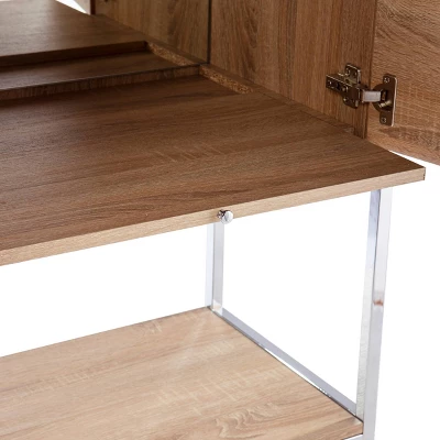 Upgrade your home bar storage with the Aiden Lane Befail Tall Bar Cabinet with Wine Storage. A double-door cabinet and three open shelves store everything from glassware to spirits, while a convenient pull-out tray serves up cocktails and appetizers in style. Add this modern wine cabinet to your dining room to enjoy mixed drinks at your next dinner party, or tuck into your living area to double as a bookshelf or coffee bar. Make the most of your small space or open concept floorplan with this tall bar cabinet. Overall: 25.25” W x 15.75” D x 68” H