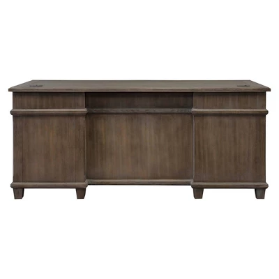 Constructed of solid wood and veneers, Carson Office fits well in any home or executive office with four utility drawers for all storage needs and two letter file drawers for all storage needs. Weathered dove finish accentuates the natural open grain, creating a casual yet elegant look. Mottled antique finish hardware and four point diamond metal accents enhance the Carson collection.