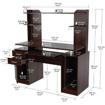 Computer Work center w/Hutch by Inval finished in a rich “Espresso” laminates in durable melamine which is stain, heat and scratch resistant. Constructed from manufactured wood. This unit offers an ample work surface making perfect for any home office or office. One pedestal has two accessory drawers with metal slides and a concealed storage compartment. The other pedestal is an open compartment for storage or a CPU. It includes a pull-out keyboard shelf with metal slides with brushed metal handles and risers. The hutch features three shelves to accommodate accessories. Both pedestals have plastic base gliders to protect the unit when moving it.