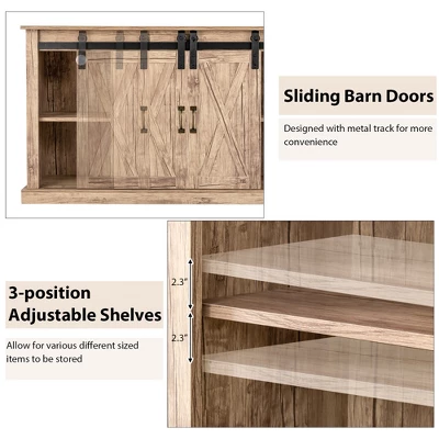Our TV stand is a charming complement to your home that combines practicality and beauty! Featuring a wide tabletop, this TV stand can hold up to 65” of TV. The sliding barn doors and 3-tier open shelf provide you with multiple storage options for assorting wide arrange of media items. Reasonable space arrangement creates a clean and tidy impression for your home. You can also use it as a console table to facilitate storage. Moreover, the pre-drilled cable management holes are designed to keep wires organized. Equipped with the anti-tipping device, the media console table can be attached to the wall to avoid wobbling. With chic appearance and modern design, the TV cabinet matches seamlessly with any interior decoration and also adds a touch of elegant charm to your home.