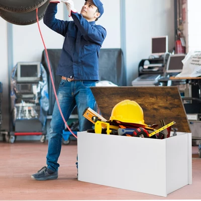 This multifunctional storage bench with a rustic brown top and white body is a practical and aesthetic addition to your living space. Featuring a self-hold lid and large internal space, the chest makes it a breeze for you to store your sundries and search something inside. Meanwhile, the wide top can be used as a seat when it is closed, firmly holding 200 lbs of weight. Excellent in materials and workmanship, the storage bench is very sturdy and durable. And there are anti-collision pads and bottom pads to give you a better using experience. Moreover, it is a versatile piece of furniture that can be widely used in your home, including in the garage, hallway, and living room.