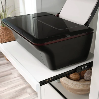 Functionality, style, and storage – all in one fantastic furniture piece. Give your home the additional storage space it needs – in the office or in any room – without sacrificing the trendy design you love with this storage cabinet with file drawers from the Cottage Road collection. Display what you wish and hide the other stuff – this large storage cabinet features a sliding door that allows you to display on one side and have hidden storage on the other. This storage cabinet with shelves features three adjustable shelves that can move to different heights to create flexible storage for items of all shapes and sizes. Store items like manuals, binders, paper reams, spare blankets, linens, and organizing bins. On the open side, display mementos, decorative plants, photos of family, or other keepsakes. And, if that’s not enough, this storage cabinet has two drawers with full extension slides that can accommodate letter-size hanging files. Finished in white with a 1″ thick top panel in Lintel Oak accent, this display storage cabinet with shelves and drawers will have you feeling clutter-free in no time.