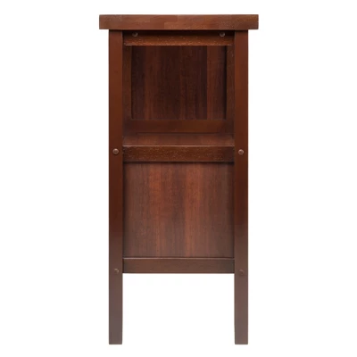 This buffet table provides classic elegance to your dining room. It features two wine racks hold up to 8 bottles and two side open shelves for plates or glasses. There is a drawer to storage your serving accessories. Two single and a middle double wood doors open to reveal three cabinets for additional space for your entertaining needs. Buffet Table assembled size is 46″W x 16″D x 34″H. There is two open Shelves with size of 12″W x 14″D x 12″ Clearance for plates or decorations. Bottom section has three cabinets. Two side cabinet inside is 12″W x 13″D x 11.61″H. Middle Cabinet is 16.54″W x 13″D x 11.61″H. It also has one pull out drawer with an inside dimension of 16.37″W x 11″D x 2.3″H. Made from combination of solid and composite wood in Walnut finish. Assembly Required.