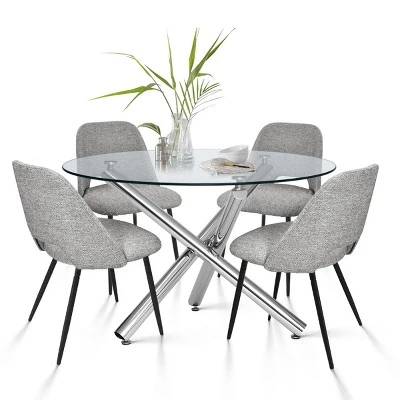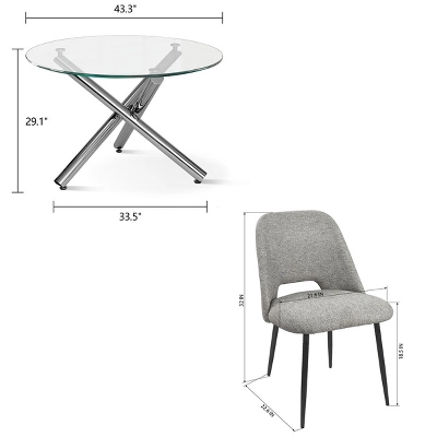 The Pop Maison Dining Room Set crafted of durable metal construction with temperesd clear glass top and surrounded by modern 4 Upholstered Lovely Chairs.43.3” L x 43.3” W, this table comfortably seats four. CHROMED silver SCULPTURE legs creates an OPEN and AIRY design, while BEVELLED TEMPERED glass edge makes a sophiscated look, and allows the beauty of the construction to be exposed.Each chair features an engineered wood frame with foam seat padding and polyester blend upholstery. The seatback is curved, and the black steel legs are flared, offering support for up to 250 lbs. Complete the look in any contemporary or mid-century modern dining room or kitchen with this stylish set.