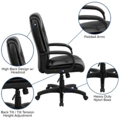 When you have had a long workday and need to ease body fatigue, this reclining ergonomic executive office chair will be a lifesaver. The high back design with headrest and black LeatherSoft upholstery give this chair an understated style that will look great in your workspace. LeatherSoft is leather and polyurethane for added softness and durability. This multi-functional reclining office chair embodies the best of both worlds for exceptional comfort and body support that’ll help you power through endless contracts and reports. You can go from a seated position to a relaxed, reclined state in seconds with the touch of a lever. This ergonomic office chair offers you a standard pneumatic seat height adjustment with the added bonus of a reclining back and easy touch adjustable footrest. When you’re ready to get back to business this functional task chair will let you get on with your day, and feel good while doing it. Additional Features: Depth Adjustable Footrest, Padded Arms with CAL 117 Fire Retardant Foam, Pneumatic Swivel Seat Height Adjustment, Heavy Duty Nylon Base, Dual Wheel Casters, LeatherSoft is leather and polyurethane for added Softness and Durability
