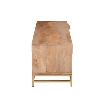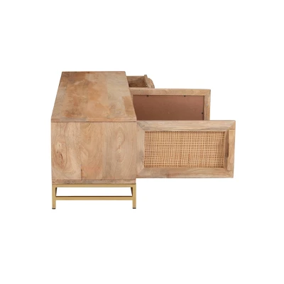 Raw, rustic craftsmanship is outfitted with modern efficiencies to create this compelling media console. The solid mango wood frame is given a natural lacquer finish to highlight its beautiful wood grain and pair seamlessly with gold’s iron base. A set of doors with natural cane from rattan swing open to reveal a spacious storage compartment, ideal for dinnerware, blankets, or electronics. To their right, two sliding drawers offer additional options for stowing away loose items, helping to keep your entertainment space tidy.