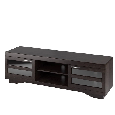Add a sleek contemporary look to your home theater display with this new extra wide TV bench. Sliding tempered glass doors framed with solid wood offer the perfect stage for up to an 85″ TV while providing the ideal space to safely conceal your components and accessories. Brushed aluminum hardware and spacious open shelves make this extra wide design the perfect way to sit down and enjoy your flat screen TV and home entertainment system. Maximize your living room or entertainment space with the versatility of both open and closed storage.