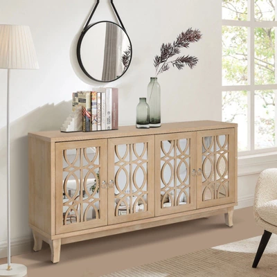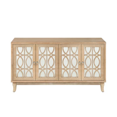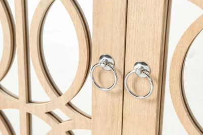 Looking for a storage solution that combines functionality with a touch of elegance? This contemporary Storage Cabinet with Mirrored Doors is a perfect choice for your home. With its sleek design and high-quality materials, this cabinet is built to last and provides perfect stability and durability.The cabinet’s four mirrored doors add a touch of glamour and sophistication, reflecting light and adding a sense of spaciousness to any room. The hidden storage areas behind the doors provide ample space for storing all of your daily essentials, keeping your home clutter-free and organized.Crafted from a combination of high-quality manufactured wood and metal materials, this cabinet is not only stylish but also built to withstand everyday use. And with its neutral hues, this cabinet is versatile enough to blend seamlessly with any home decor style, making it a great addition to your living room, dining room, or bedroom.Overall, if you’re looking for a storage solution that combines functionality and style, this Storage Cabinet with Mirrored Doors is the perfect choice for you.