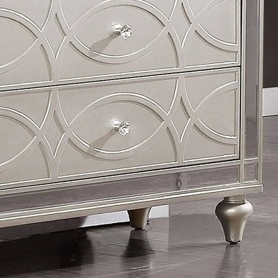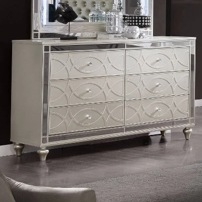 Bask in the cool and timeless chic of this exquisite six drawer dresser. Glam details like turned feet, mirror accents, a sleek silver finish and a stylized intersecting circular pattern on the drawer fronts make this piece a stunning addition to your bedroom. Add opulence to your bedroom with the glamorous design of this dresser.