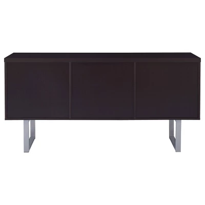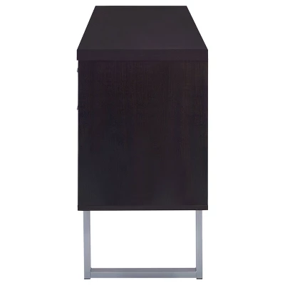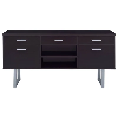 Extend the utility of an office desk with this beautiful credenza. Built with a linear silhouette, its minimalist design is flattering to a contemporary office. Deep cappuccino brings a dramatic finish. Metal U-shaped legs and hardware add perfect finishing touches. Storage and utility are top-notch with a top drawer, an open shelved compartment. and two file drawers.