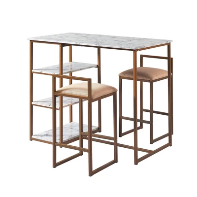 Add a modern accent to your living space with the Teamson Home Marmo Modern Marble-Look Breakfast Table Set with Storage. This Greek-inspired bistro set features a modular design complete with a gold-brushed base and a glossy faux-marble top for an elegant addition to your dining area. The two included matching bar stools complete your breakfast nook and slide easily under the table when not in use for a space-saving dining solution. The breakfast table’s three shelves provide ample storage for kitchen and bar accessories, glasses, and more. Constructed from durable materials, this modern table is stain and scratch resistant with easy-to-clean surfaces that make wiping up every day spills a breeze. Purchase this dining set on its own or with other items from our Marmo collection to add a matching furniture set and a more cohesive look to your home. For quick and easy assembly, this table includes step-by-step instructions. The Teamson Home Marmo Modern Marble-Look Breakfast Table Set with Storage measures 42″ x 56″ x 36″ to provide a complete dining solution to your space without taking up too much room.
