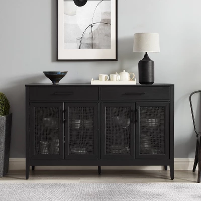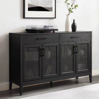 Ready to blend with a variety of home styles, the Milo Sideboard has a simple design with unique details. The large cabinet doors feature beautiful poly-rattan mesh panels, which conceal adjustable and removable shelves. Whether used as a traditional sideboard, credenza, or TV stand, the Milo Sideboard is the perfect multipurpose furniture piece. OVERALL PRODUCT DIMENSIONS: 56”W X 15.75”D X 36”H