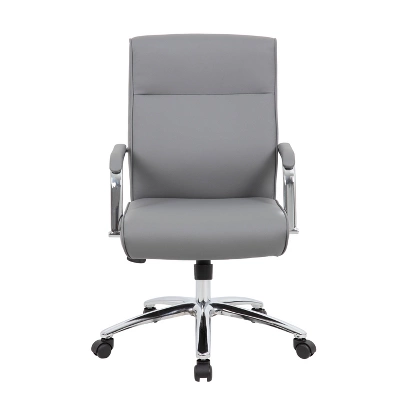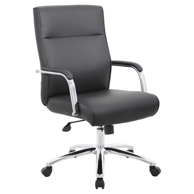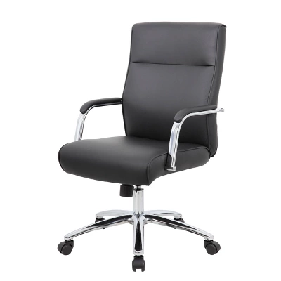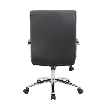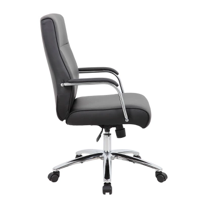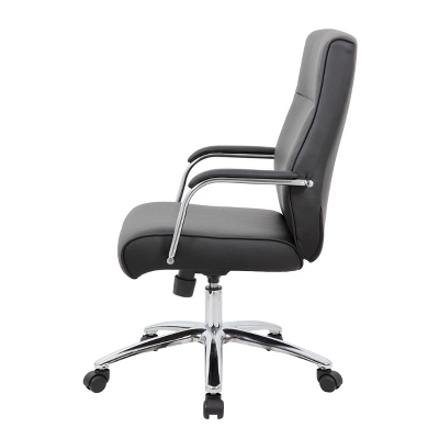 The Modern Executive Conference Chair in black is a fine looking chair made with high quality CaressoftPlus vinyl. CaressoftPlus is a trademarked, ultra-soft, breathable upholstery that looks & feels like leather, but more durable & easy to clean. The chair also features a spring tilt mechanism that allows one to change the angle of the entire seat relative to the floor and allows one to transfer some of the upper body weight to the backrest of the chair. In addition to this the chair also boasts a sturdy 27 inch chrome base with 2 inch nylon dual wheel castors and a 275 lbs. weight capacity.