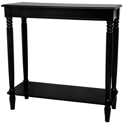 Traditional American style hall or console table, with a beveled top and a lower shelf to reinforce stability. Lathed legs have ornate accents near the top and bottom shelves. Ideal size for behind a small sofa or settee or along a hallway. Built to last. Some simple assembly is required.