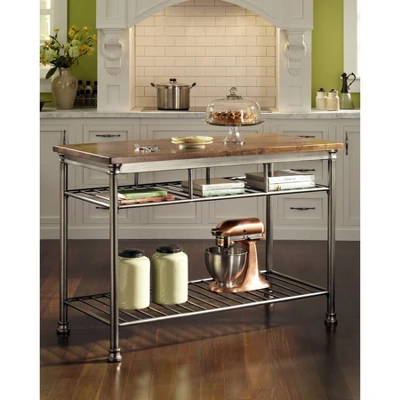Equal parts industrial and modern, the Homestyles Orleans kitchen island brings everyone together while also keeping everything neatly organized. The upper storage rack is perfect for laying wine bottles on end to protect the cork, while the fixed bottom shelf can hold larger items. The butcher block top can be used as a valuable prep space, or simply as a beautiful way to present a centerpiece.