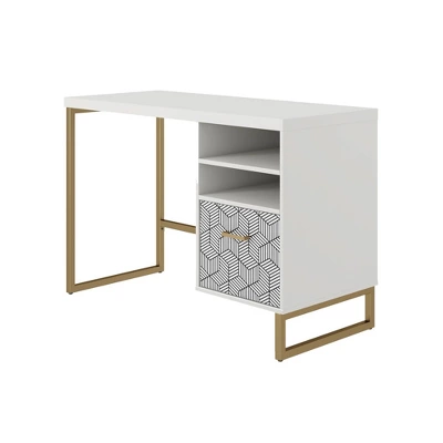 Bow down to the CosmoLiving by Cosmopolitan Scarlett Single Pedestal Desk. Designed with a modern silhouette, the pedestal desk comes in a crisp white or graphite gray finish. The Scarlett is built on durable gold metal legs with a roomy patterned drawer to store your ~things~ and two open shelves to obsessorize. Made with your organizational desires in mind, this desk is a match made in home office heaven.