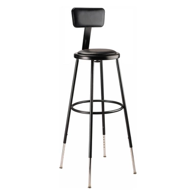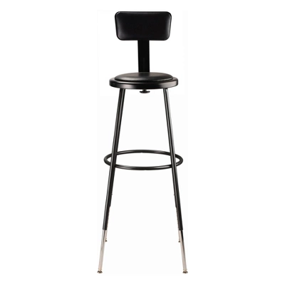 The fortified construction and soft comfort of the black 6400 Series heavy-duty padded stools with backrests are ideal for hands-on educational settings like art rooms, science labs, home economics or shop classrooms. These reliable stools feature a sturdy frame of 18-gauge steel tubing securely welded to a 14 inch diameter seat pan. Riveted through the steel pan are . 5 inch -thick black vinyl cushioning that will provide years of dependable use. Footrest ring is securely bonded to each leg with four spotwell contact points. Height-adjustable legs extend from 32 inches to 39 inch in 1-inch increments and adjustable padded backrests can be moved 2 inches up/down and forward/back.