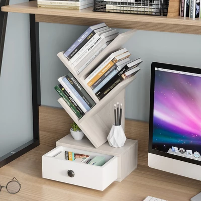 The desktop bookshelf can solve the problem of limited space.Designed with 5 shelves and a drawer,the bookcase offers adequate storage to keep CDs,magazines,books and decorations organized. More,all shelves are designed with different heights,which makes the entire bookshelf like a growing tree. Thanks to its compact frame,the display storage shelf is especially ideal for uses on the desktop. Finally,the assembly and maintenance are very convenient.