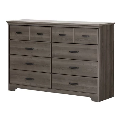 Bring rustic charm to your bedroom decor with the Versa 8-Drawer Double Dresser from South Shore. This dresser stands a little over 36 inches high, giving you plenty of storage across eight side-by-side drawers, as well as ample surface space to stash accessories, decorative accents or a lamp. Create a cohesive look in your bedroom decor by pairing this dresser with other pieces from the Versa collection from South Shore.