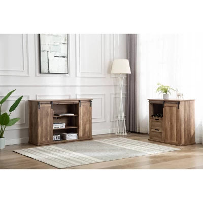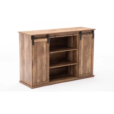 - This TV stand provides abundant storage with cabinets and shelves in each. Sliding barn doors and their flexibility allow easy access to all cabinets. Beyond its functionality, asymmetrical design with the finest wood grain also matches every sense of style in your living room
